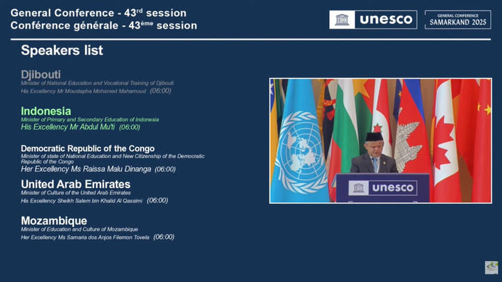 AUTENTIKWOMAN.Com– Menteri Pendidikan Dasar dan Menengah (Mendikdasmen), Abdul Mu’ti, menyampaikan pidato di forum UNESCO, Uzbekistan, Selasa, 4 November 2025.