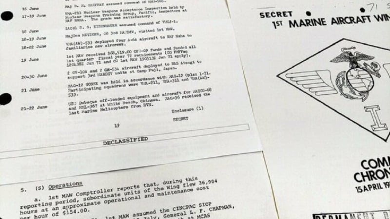 Dokumen-dokumen yang dikenal sebagai “Command Chronology” dan terkait dengan pusat komando Amerika di Iwakuni, Prefektur Yamaguchi, Jepang, antara tahun 1970 hingga 1974, menunjukkan bahwa Angkatan Udara Amerika yang ditempatkan di pangkalan tersebut setidaknya antara tahun 1971 hingga 1975 telah menyelenggarakan latihan di Okinawa dengan kemampuan penggunaan senjata nuklir.