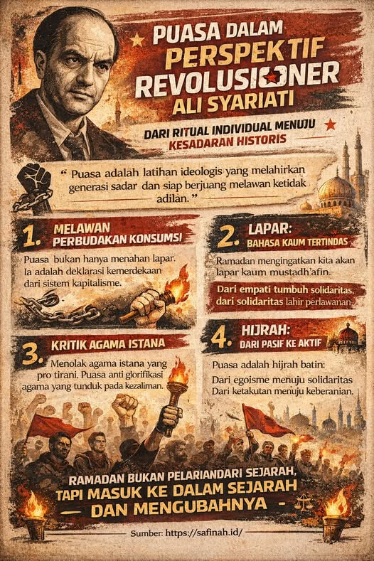 Syariati membedakan antara agama yang membius dan agama yang membebaskan. Puasa bisa menjadi candu jika hanya dirayakan sebagai tradisi tanpa transformasi. Tetapi ia menjadi energi revolusioner jika melahirkan kesadaran sosial dan keberanian historis.