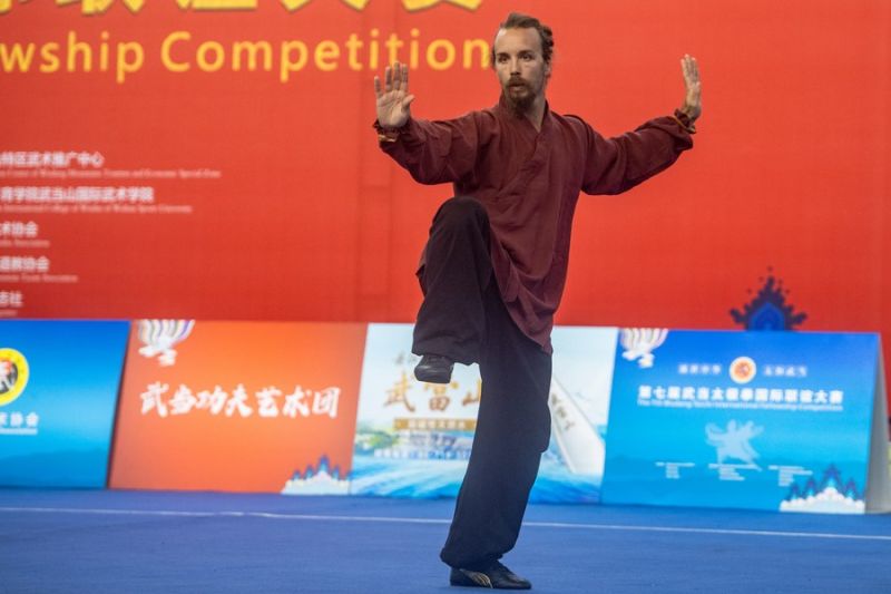 Daniele Pedrazzini dari Italia berkompetisi pada Kompetisi Beasiswa Internasional Wudang Taichi ke-7 di Shiyan, Provinsi Hubei, Tiongkok tengah, pada 23 Oktober 2023. (Xinhua/Du Zixuan)